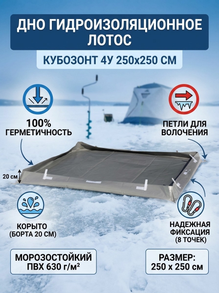 Дно гидроизоляционное Лотос КубоЗонт 4У - ОписаниеДно гидроизоляционное Лотос КубоЗонт 4У имеет четырехгранную форму размером 250 х 250 см, предназначено для палатки "Лотос КубоЗонт 4У, (крепится к внутреннему тенту палатки). Гидроизоляционное дно изготовлено из цельнокроеного прочного морозостойкого материала ПВХ плотностью 630 г/м2 и выполнено по форме корыта с защитными бортами высотой 20 см. Небольшой вес и компактный размер в сложенном виде, позволяют укладывать гидроизоляционное дно в сумку вместе с палаткой.