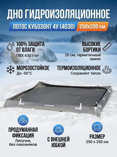 Дно гидро-термоизоляционное Лотос КубоЗонт 4У (4038) - ОписаниеДно гидроизоляционное КубоЗонт 4У (4038) предназначено для гидроизоляции пола и нижнего периметра стенок жилого пространства палаток.