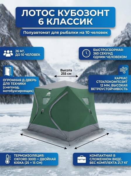 Палатка полуавтомат Лотос КубоЗонт 6 Классик - ОписаниеБыстросборная палатка Лотос КубоЗонт 6 Классик предоставит особый интерес для любителей подледного лова, которым необходима именно большая зимняя палатка для организации отдыха в большой компании из 5 и более человек или для отдыха в малой компании, но в максимально просторных и комфортных условиях.