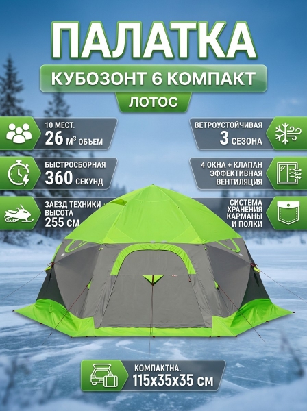 Палатка полуавтомат Лотос КубоЗонт 6 Компакт - ОписаниеБыстросборная палатка Лотос КубоЗонт 6 Компакт предоставит особый интерес для любителей подледного лова, которым необходима именно большая зимняя палатка для организации отдыха в большой компании из 5 и более человек или для отдыха в малой компании, но в максимально просторных и комфортных условиях.