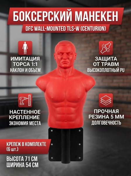 Груша-манекен для бокса DFC WALL-MOUNTED PUNCHING MAN TLS-W - ОписаниеНастенный боксерский манекен CENTURION TLS-W — отличное решение для домашних тренировок! Он идеально подходит для новичков и любителей боевых искусств, помогая отрабатывать технику ударов, координацию и работу ног. Благодаря стационарному креплению вы получаете устойчивую и неподвижную цель, что особенно важно для точности и безопасности на начальном этапе занятий. Манекен крепится к стене, освобождая пространство и обеспечивая максимальную устойчивость. Такая конструкция исключает смещения во время тренировок, позволяя сосредоточиться на силе и направлении удара. Упор на точечную работу делает его отличным инструментом как для отработки джебов, кроссов и хуков, так и для базовой самообороны. Изготовленный из модифицированной резины толщиной 5 мм и наполненный полиуретановой пеной высокой плотности, манекен отличается высокой прочностью и реалистичной обратной связью. Материалы обеспечивают отличную амортизацию, снижая нагрузку на суставы и минимизируя риск травм, даже при интенсивных тренировках. Манекен не только улучшает физические показатели, но и способствует снижению стресса. Реалистичное сопротивление и безопасные материалы позволяют эффективно «выпускать пар» и справляться с эмоциональным напряжением. Это делает манекен полезным не только для спортсменов, но и для широкой аудитории, включая офисных работников и людей, стремящихся к эмоциональной разрядке. Благодаря прочной МДФ-спинке и продуманной конструкции, манекен выдерживает сильные удары руками и ногами. Он подходит как для комплексных силовых тренировок, так и для отработки быстроты реакции. Компактный, надёжный и долговечный, CENTURION TLS-W станет отличным дополнением к вашему тренировочному пространству. Гарантия на детали подверженные естественному износу в процессе эксплуатации — до 6 месяцев с момента установки тренажера при условии регулярного планового ТО. Важно: гарантия не распространяется на преждевременный износ из-за чрезмерной эксплуатации тренажера.