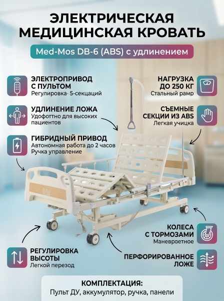 Кровать электрическая Мед-Мос DB-6 (ABS) с удлинением - ОписаниеКровать электрическая Med-Mos DB-6 (ABS) с удлинением предназначена для использования в медицинских учреждениях, реанимационных отделениях и для домашнего ухода. Она идеально подходит для пациентов любого роста благодаря функции удлинения ложа. Электрическая регулировка секций ложа позволяет обеспечить максимальный комфорт и удобство при уходе за пациентами.