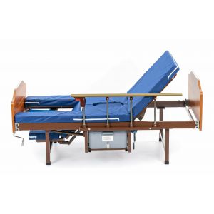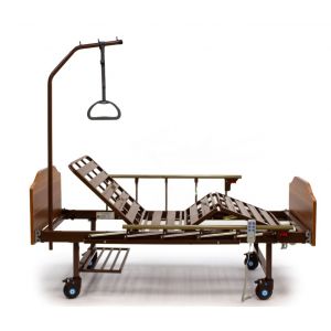 Положение секций регулируется винтовым приводом. Удобство пациенту создают, изменяя угол наклона головной и ножной секций. Рама и ножки - из нержавеющей стали. Съемные спинки, боковые ограждения - также из стали, их можно снять, опустить и подойти к пациенту с любой стороны. Выдвижные регуляторы положения ложа предусмотрены в ножной части кровати.