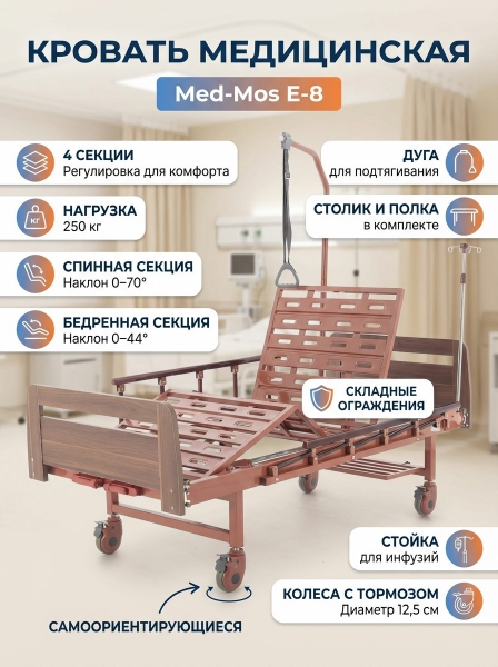 Кровать медицинская Мед-Мос E-8 (ММ-2024Н-00) - ОписаниеКровать механическая Med-Mos Е-8 (MM-2024Н-02) (2 функции) ЛДСП с полкой и обеденным столиком.