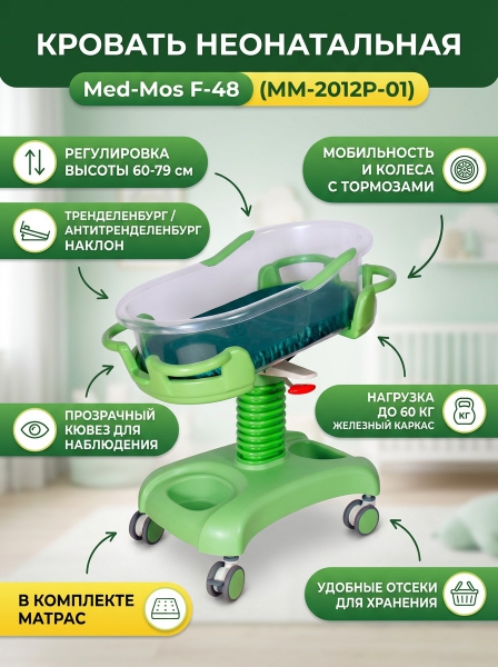 Кровать для новорожденных Мед-Мос F-48 (MM-2012P-01) - ОписаниеКровать неонатальная предназначена для помещения в ней новорожденного и перемещения его в пределах родильного отделения. Пластиковый кожух выполнен из формовочного ударопрочного пластика и имеет два отделения для аксессуаров.