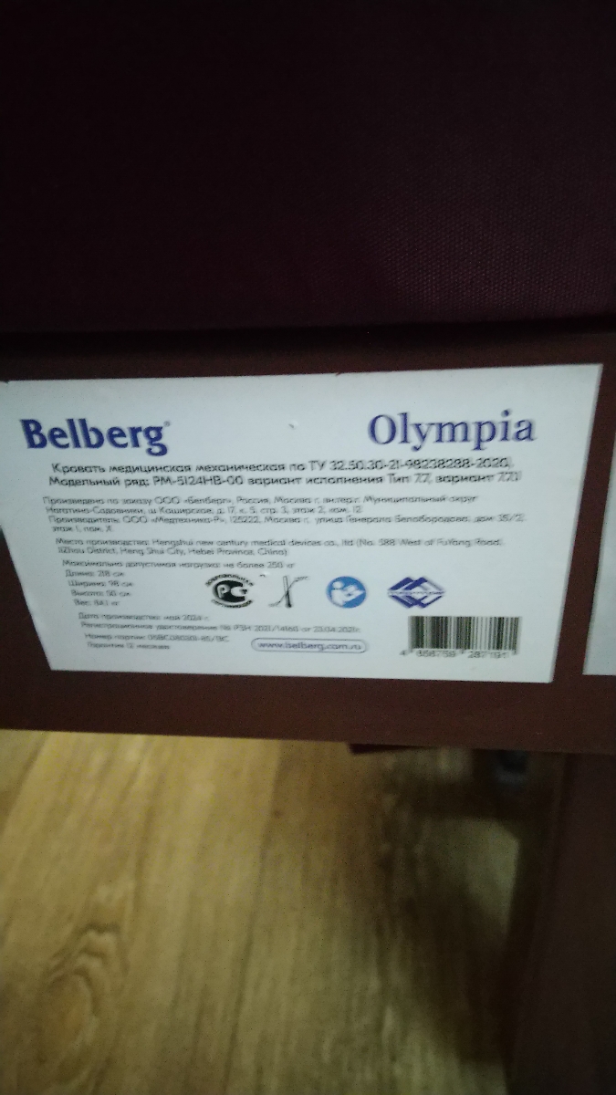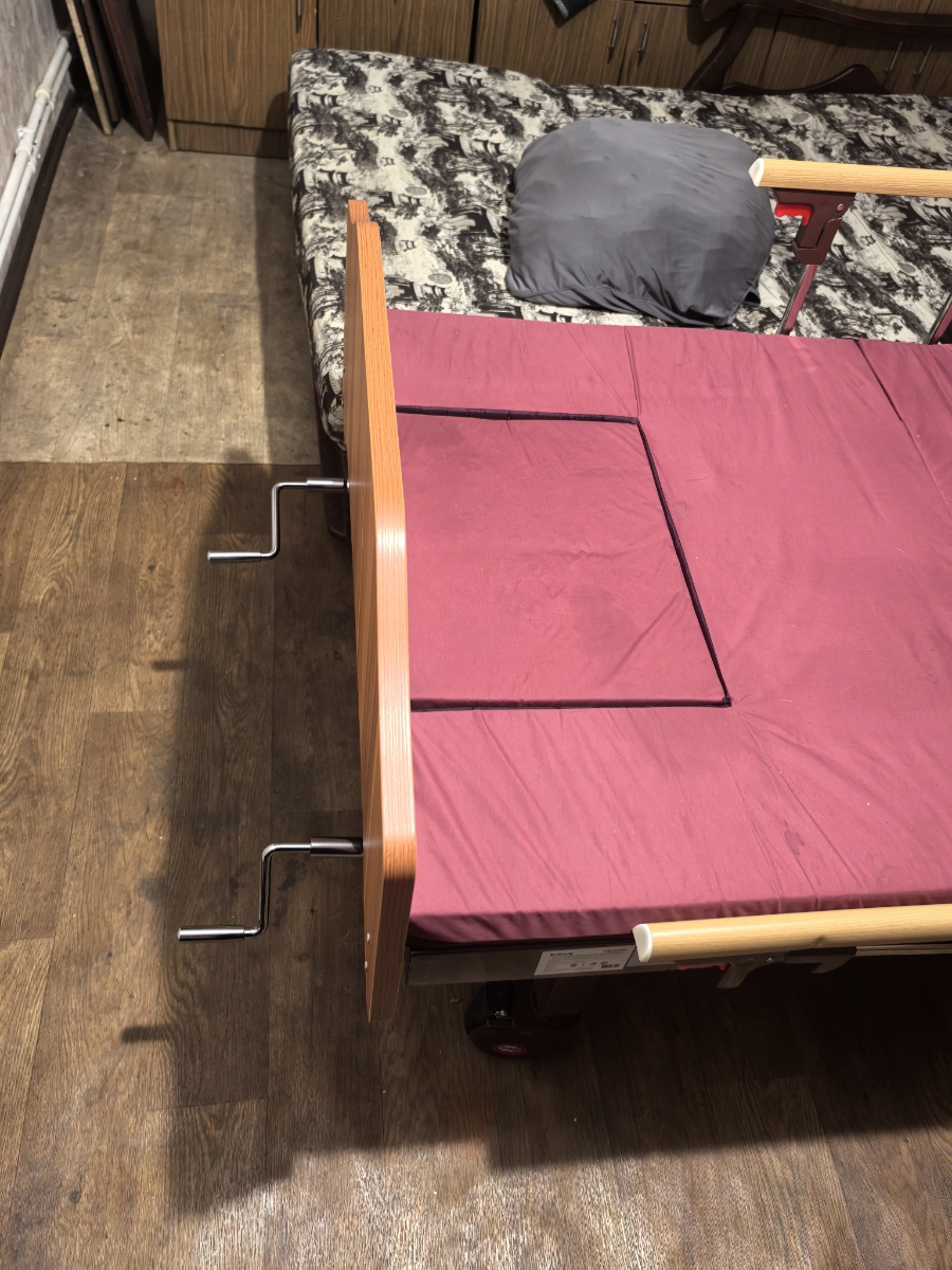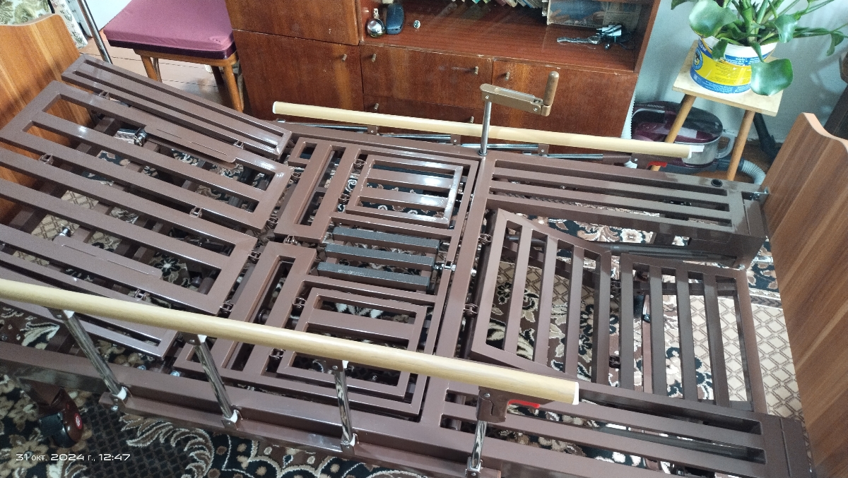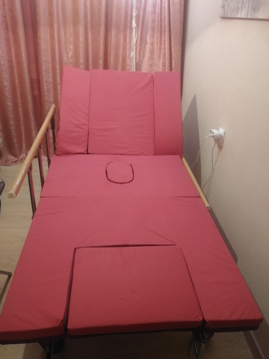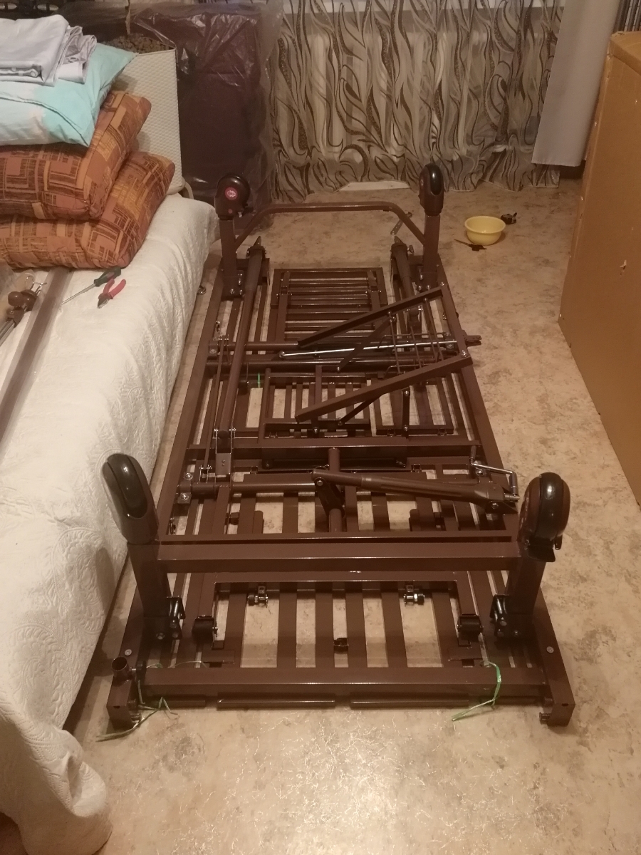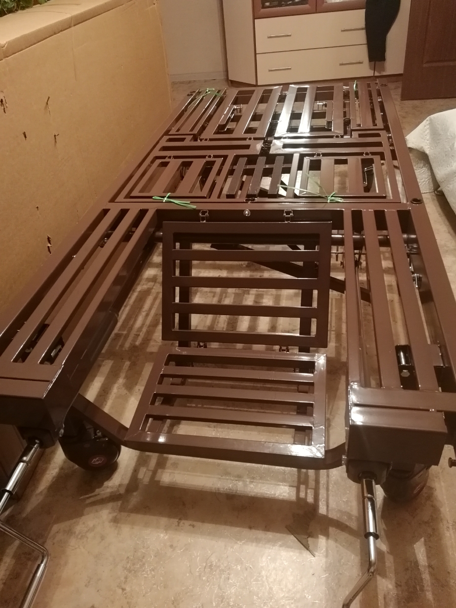 Кровать навороченная, собирается не сложно (присланная инструкция почти бесполезная) осталось с десяток болтов и гаек. Непонятно как пользоваться отверстием для ипражнений, получается больной должен лежать на ней голой попой, короче бесполезная вещь. В остальном очень удобная в плане трансформаций. Секции матраса сразу не привязывайте, привязал не правильно и при поднятии секции, порвал завязки.