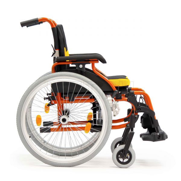 Коляска оснащена пневматическими колесами, обеспечивающими плавный ход и амортизацию на неровных поверхностях. Во время остановки коляска надежно фиксируется боковыми стояночными тормозами.
