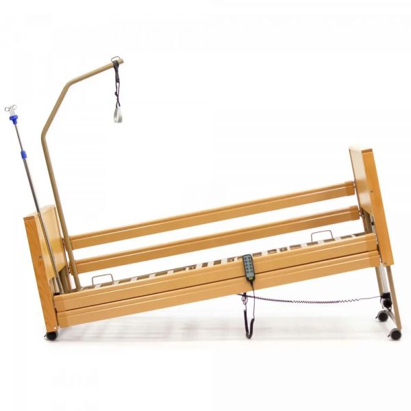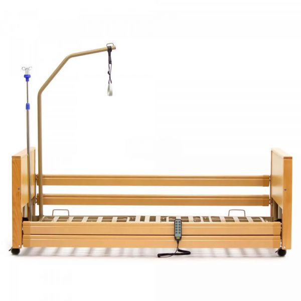 По периметру кровати предусмотрены четыре специальных отверстия для крепления инфузионной стойки и других аксессуаров. В комплектацию входит инфузионная стойка, а также штанга для подтягивания пациента, оснащенная регулируемой по высоте рукояткой.