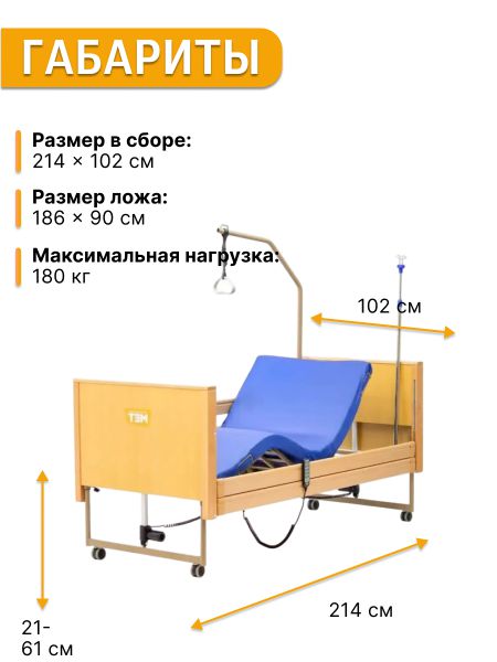 Кровать оснащена функцией регулировки положения изголовья, ножной и бедренной секций, которая осуществляется с помощью проводного пульта управления. Механизм «растомат» отвечает за настройку ножной секции. Высота ложа также может быть изменена в зависимости от потребностей. Боковые ограждения легко опускаются, что обеспечивает удобный и быстрый доступ к пациенту. Максимальная нагрузка, которую выдерживает кровать, составляет 170 килограммов.