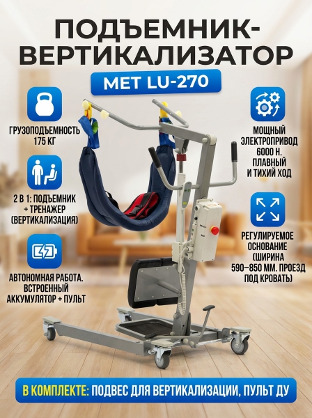 Подъемник-вертикализатор с электроприводом MET LU-270 - ОписаниеЭлектрический подъёмник LU-270 предназначен для перемещения пользователя в вертикальном положении. Эта модель позволяет людям с ограниченными возможностями передвижения снова научиться стоять вертикально и перемещаться из одной точки в другую. Устройство можно использовать как дома, так и в лечебно-профилактических учреждениях.