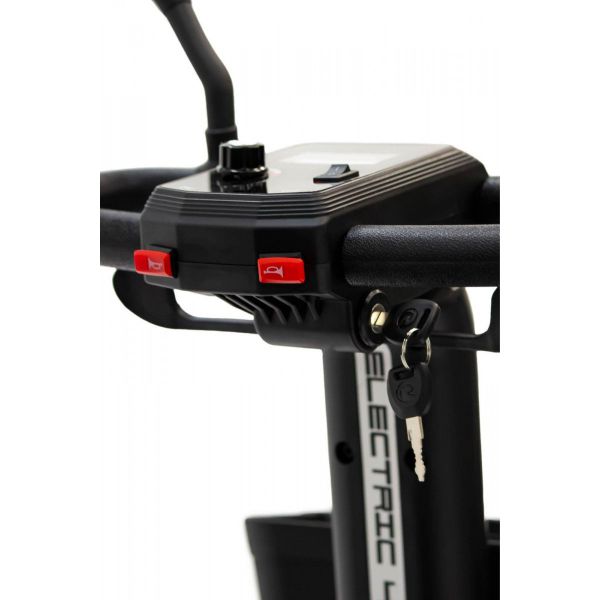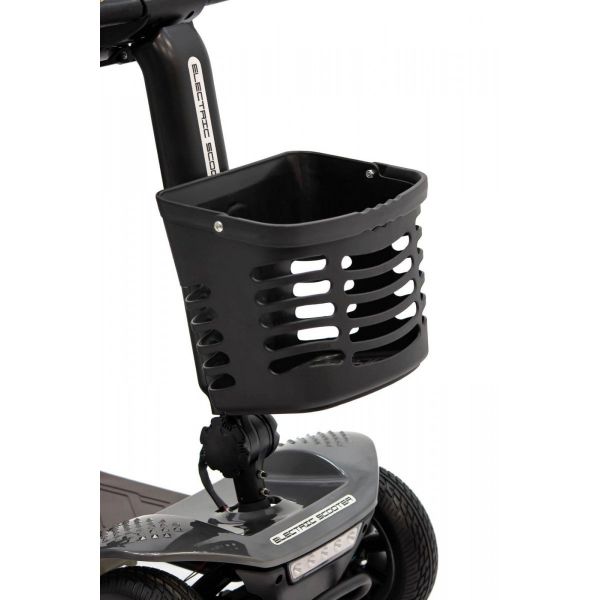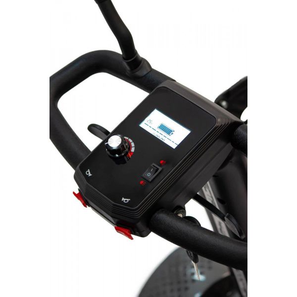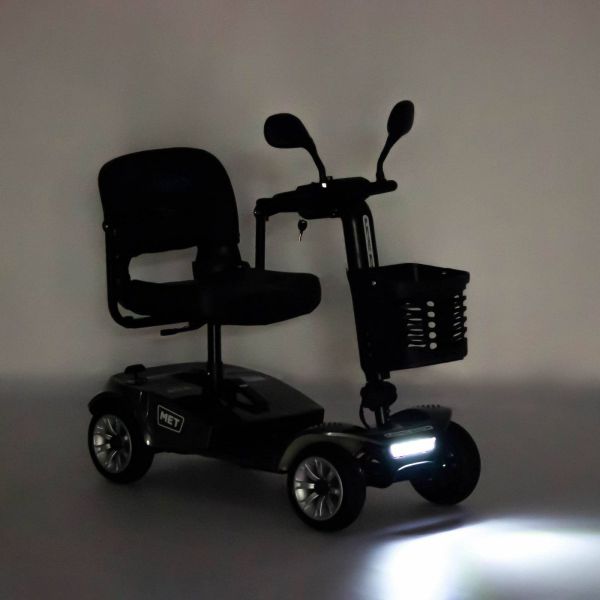 Комфорт и безопасность пользователей Модель имеет четыре колеса и антиопрокидыватели, что обеспечивает его устойчивость. Сиденье вращается на 360 градусов для удобной и безопасной пересадки с инвалидного кресла. Электроскутер MET EXPLORER 300 оснащен пластиковой корзиной для перевозки вещей, расположенной на руле устройства. Управление движением осуществляется нажатием на рычаги, которые находятся под рулём. Для безопасности поездки электроскутер оснащен зеркалами заднего вида и фарами. Также скутер имеет панель управления, на которой отображается уровень заряда и время работы с момента включения.