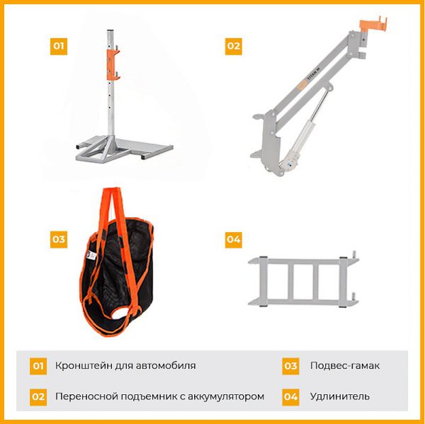 Переносной модульный подъемник - оснащен встроенным аккумулятором и пультом управления на длинном витом шнуре. Диапазон изменения высоты 50 см. Итоговая высота зависит от используемого кронштейна, посадки в гамаке и антропометрических данных пользователя. Грузоподъемность подъемника 150 кг (без калитки удлинителя). Принципиально другая посадка в сравнении с классическими подъемниками, траверса располагается не над человеком, а в районе груди.