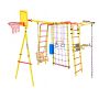 Яркий спортивно-игровой комплекс, предназначенный для установки под открытым небом. Отличается богатой комплектацией. За счет надежного металлического каркаса выдерживает вес до 100 килограмм, поэтому подойдет не только детям, но и большинству родителей. Помимо каркаса с лестницей и рукоходом, устройство укомплектовано баскетбольным щитом с кольцом, турником, брусьями, канатом, веревочной стенкой для лазанья, гимнастическими кольцами.