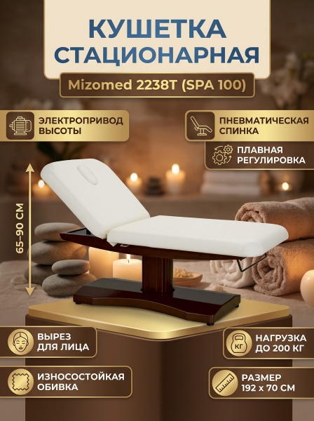 Кушетка стационарная Mizomed 2238T - ОписаниеКушетка для Спа-процедур SPA 100 - стильная и компактная современная модель, которая идеально подойдет для оснащения салона красоты широкого профиля. Благодаря современному эргономичному дизайну она создаст идеальный комфорт для клиента и удобные условия работы для мастера.