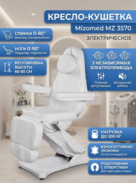 Кресло-кушетка Mizomed MZ 3570 - ОписаниеКосметологическое кресло MZ 3570 — это современное решение, созданное для безупречного комфорта клиента и максимального удобства косметолога. Модель с электроприводом обеспечивает бесшумную и плавную настройку положений, что делает каждую процедуру комфортной и эффективной.