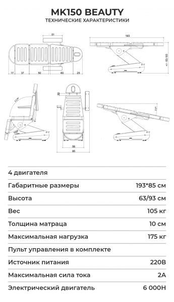 Косметологическое кресло Mizomed MK150 BEAUTY LaREiNA - ОписаниеИнновационная кушетка с 4-мя двигателями, максимальной устойчивостью и сверхкомпактным основанием. Корпус основания — сталь! Двигатели позволяют легко регулировать спинку, подножку, высоту и положение угла наклона кресла с помощью пульта ручного управления.