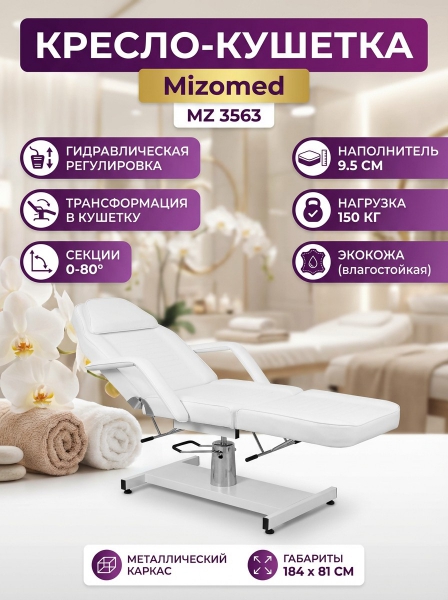 Кресло-кушетка Mizomed MZ 3563 - ОписаниеКосметологическое кресло MZ 3563 на гидравлике — надежное и функциональное решение для салонов красоты, обеспечивающее комфорт клиентов и удобство работы специалистов. Модель сочетает плавную гидравлическую регулировку, простоту механической настройки и современный дизайн. MZ 3563 идеально подходит для косметологических процедур, массажа лица, ухода за кожей и других эстетических услуг. Его эргономичность и регулируемые элементы создают комфортные условия для клиента и удобство работы для мастера.