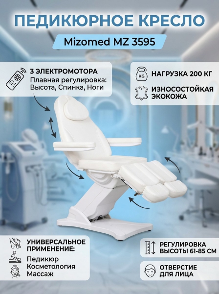Педикюрное кресло Mizomed MZ 3595 с электроприводом - ОписаниеВысококомфортабельное кресло. Оснащено тремя электромоторами для контроля высоты, угла наклона спинки и ножной части. Подвижные подлокотники, подголовник с отверстием для лица. Высококачественная и легкоочищаемая обивка из прочной экокожи.