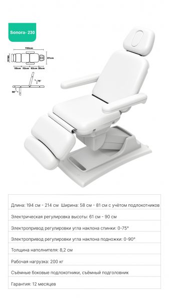 Косметологическое кресло с электроприводом Mizomed Sonora 230, 3 мотора