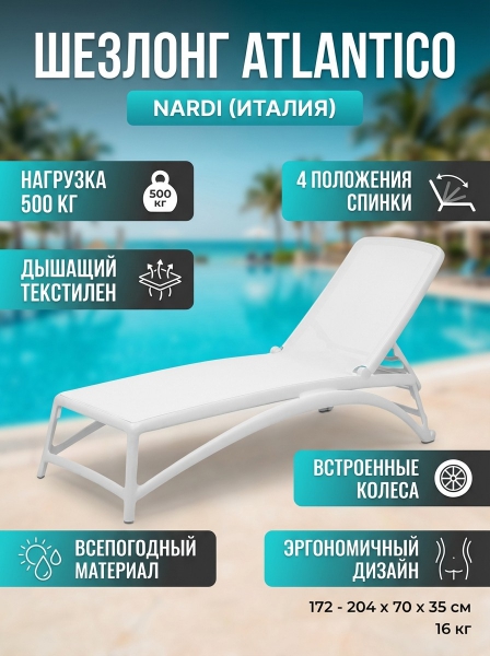Шезлонг-лежак пластиковый Nardi Atlantico - ДоставкаДоставка по Санкт-Петербургу: бесплатно, 2-3 дня Доставка по России: стоимость уточняйте у оператора. Шезлонг-лежак пластиковый Nardi Atlantico - Отзывы0.0