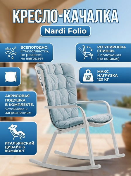 Кресло-качалка пластиковое с подушкой Nardi Folio, белый, голубой - ДоставкаДоставка по Санкт-Петербургу: бесплатно, 2-3 дня Доставка по России: стоимость уточняйте у оператора. Кресло-качалка пластиковое с подушкой Nardi Folio, белый, голубой - Отзывы0.0