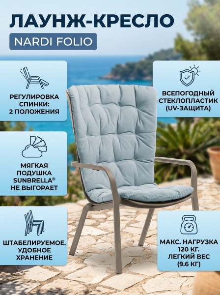 Лаунж-кресло пластиковое с подушкой Nardi Folio, тортора, голубой - ДоставкаДоставка по Санкт-Петербургу: бесплатно, 2-3 дня Доставка по России: стоимость уточняйте у оператора. Лаунж-кресло пластиковое с подушкой Nardi Folio, тортора, голубой - Отзывы0.0
