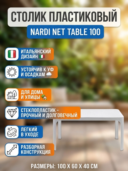Столик пластиковый журнальный Nardi Net Table 100 - ДоставкаДоставка по Санкт-Петербургу: бесплатно, 2-3 дня Доставка по России: стоимость уточняйте у оператора. Столик пластиковый журнальный Nardi Net Table 100 - Отзывы0.0