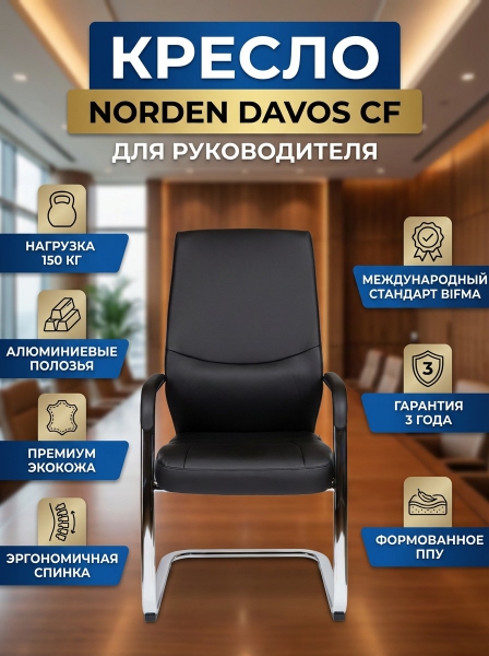 Кресло офисное Norden Davos CF - ОписаниеСомневаетесь? - Посмотрите рейтинг ТОП-10 по категории «Ортопедические кресла»Новое кресло business класса. Отделка высококачественной экокожей. В серии есть два типа директорских кресел, кресло для руководителя и конференц-кресло на полозьях. Подлокотники и крестовина из полированного алюминия. Высокое качество материалов и исполнения. Механизм качания мультиблок, выдерживающий нагрузку до 150 кг, с фиксацией наклона в любом положении. Гарантия от производителя 3 года. Сертификат BIFMA.