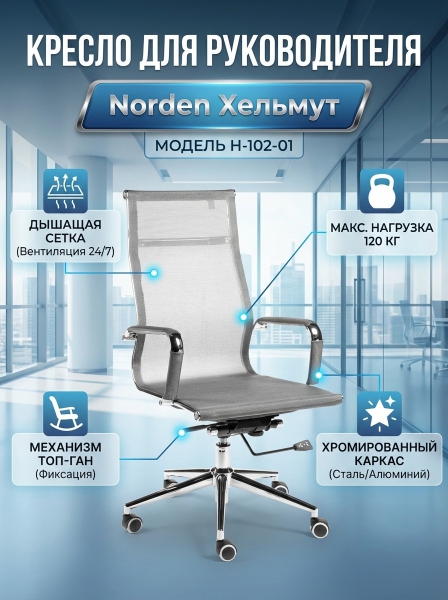 Кресло для руководителя Norden Хельмут - ОписаниеСомневаетесь? - Посмотрите рейтинг ТОП-10 по категории «Ортопедические кресла»Кресло для руководителя Хельмут является одним из ярчайших образцов современного дизайна. Если Вы хотите сделать Ваш офис или рабочее место дома еще более стильным, респектабельным, то кресло Хельмут, пожалуй, оптимальный выбор. Его отличают высокопрочная, эластичная «дышащая» сетка, хромированные металлические подлокотники со съемными накладками из сетки и надежная крестовина из полированного алюминия. Наличие механизма качания с возможностью фиксации кресла в рабочем положении позволяет снять нагрузку с позвоночника, занять максимально удобную для вас позу как при работе, так и во время отдыха. Обычно аналоги данной модели комплектуются более дешевыми крестовинами. В нашей модели крестовина дизайнерская, хромированные лучи переменного сечения сужаются к концам. Это придает креслу изысканный оригинальный вид. Подлокотники защищены съемными сетчатыми чехлами на молниях. Это особенно удобно для тех, кто не любит соприкосновения руками с металлическими подлокотниками.