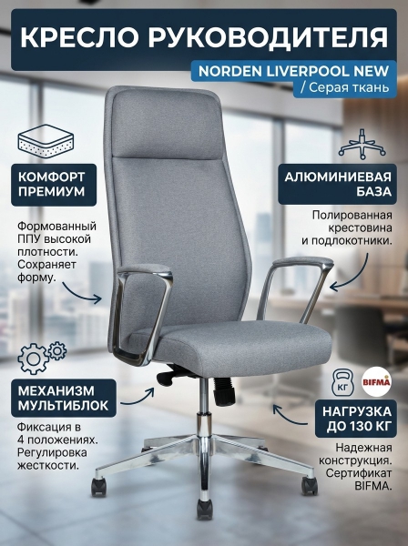 Кресло офисное Norden Liverpool New grey fabric, серая ткань - ОписаниеСомневаетесь? - Посмотрите рейтинг ТОП-10 по категории «Ортопедические кресла»Кресло руководителя бизнес класса, изготовлено из высококачественной ткани. Сиденье и спинка выполнены из формованного PU высокой плотности. Механизм качания мультиблок с фиксацией в четырех положениях. Возможность регулировки высоты и жесткости качания. Подлокотники из алюминия с тканевыми накладками. Крестовина из полированного алюминия, колеса из PU. Кресло имеет сертификат BIFMA. Максимальная нагрузка 130 кг.