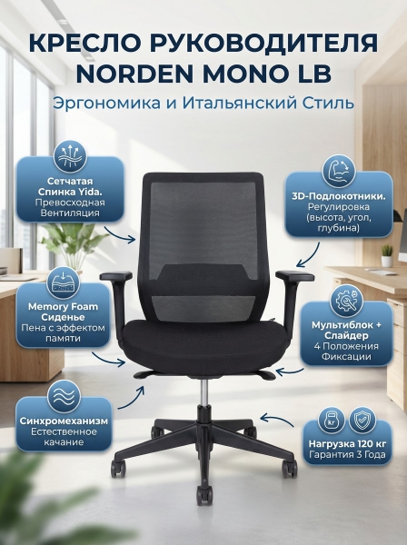 Кресло офисное Norden Mono LB - ОписаниеСомневаетесь? - Посмотрите рейтинг ТОП-10 по категории «Ортопедические кресла»Новая итальянская серия кресел совместного производства. Кресла- представляют собой итальянский стиль, оригинальный дизайн и высокую надежность. Механизм мультиблок со слайдером и системой "антишок". Фиксация качания в четырех положениях. Подлокотники регулируемые по высоте. С накладками PU Спинка выполнена из сверхпрочной сетки (производство Тайвань), Сиденье - обивка ткань разных цветовых решений с наполнителе memory foam. Кресло оснащено Газ-лифтом - BIFMA SGS. Нагрузка 120 кг. Гарантия производителя 3 года.