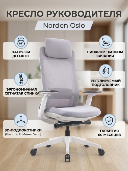 Кресло для руководителя Norden Oslo - ОписаниеСомневаетесь? - Посмотрите рейтинг ТОП-10 по категории «Ортопедические кресла»Кресло для руководителя Oslo с сетчатой спинкой и упругой поясничной опорой. Сиденье тканевое, формованное ППУ. Подголовник регулируемый. подлокотники 3D. Механизм синхро с фиксацией в четырех положениях. Система "Антишок". Газлифт 3 класса.