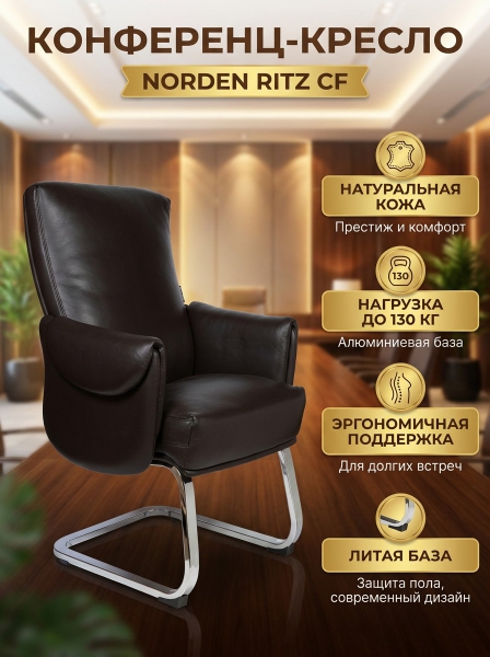 Кресло офисное Norden Ritz CF - ОписаниеСомневаетесь? - Посмотрите рейтинг ТОП-10 по категории «Ортопедические кресла»Ritz — элегантное конференц-кресло First-class, сочетающее статусный дизайн и премиальные материалы. Модель идеально подходит для переговорных, конференц-залов и кабинетов руководителей, подчеркивая престиж и внимание к деталям. Обивка выполнена из натуральной кожи, обеспечивающей комфорт и износостойкость. Надежная база из полированного алюминия придает креслу прочность и устойчивость. Конференц-кресло Ritz гармонично дополняет кресло руководителя из этой серии, создавая единый стиль рабочего пространства.
