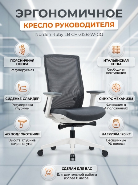Кресло офисное Norden Ruby LB - ОписаниеСомневаетесь? - Посмотрите рейтинг ТОП-10 по категории «Ортопедические кресла»Эргономичное офисное кресло с поясничной опорой с регулировкой натяжения сетки. Материал обивки спинки - итальянская армированая сетка. Сиденье тканевое, слайдер, подлокотники белые регулируемые 4D с накладкой PU. Кресло оснащено синхромеханизмом качения с фиксацией в четырёх положениях. Крестовина белая из нейлона, колеса PU.
