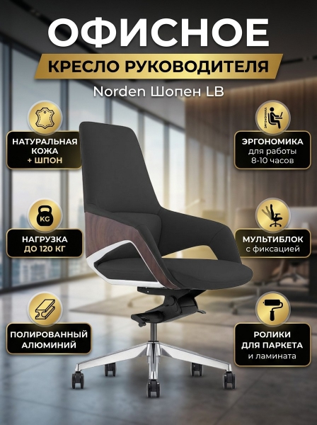 Кресло для руководителя Norden Шопен LB - ОписаниеСомневаетесь? - Посмотрите рейтинг ТОП-10 по категории «Ортопедические кресла»Офисное кресло для руководителя First class. Задняя часть отделана высококачественным пластиком под натуральный шпон. Нижняя часть спинки со вставками из полированного алюминия. У кресла механизм качания мультиблок с возможностью фиксации спинки в нескольких положениях, обивка – натуральная кожа (рабочая поверхность). Отдельное внимание стоит обратить на элегантную ручку с левой стороны под сиденьем, которая регулирует жесткость качания.