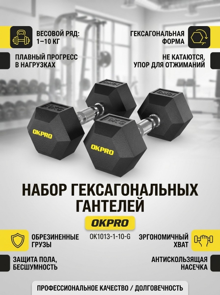 Набор гексагональных гантелей от 1 до 10 кг OKPRO OK1013-1-10-G - ДоставкаДоставка по Санкт-Петербургу: бесплатно, 2-3 дня Доставка по России: стоимость уточняйте у оператора. Набор гексагональных гантелей от 1 до 10 кг OKPRO OK1013-1-10-G - Отзывы0.0