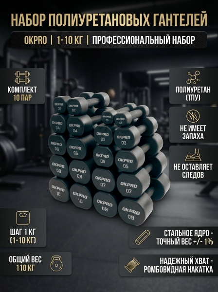 Набор полиуретановых гантелей от 1 до 10 кг OKPRO OK1025C-1-10-G серый лого - ДоставкаДоставка по Санкт-Петербургу: бесплатно, 2-3 дня Доставка по России: стоимость уточняйте у оператора. Набор полиуретановых гантелей от 1 до 10 кг OKPRO OK1025C-1-10-G серый лого - Отзывы0.0