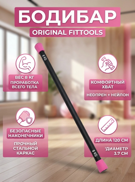 Бодибар 8 кг Original FitTools FT-BDB-8 - ОписаниеБодибар FT-BDB-8 – превосходный гимнастический шест, представляющий собой стальную основу, заключенную в упругий неопрен и розовые наконечники по краям.