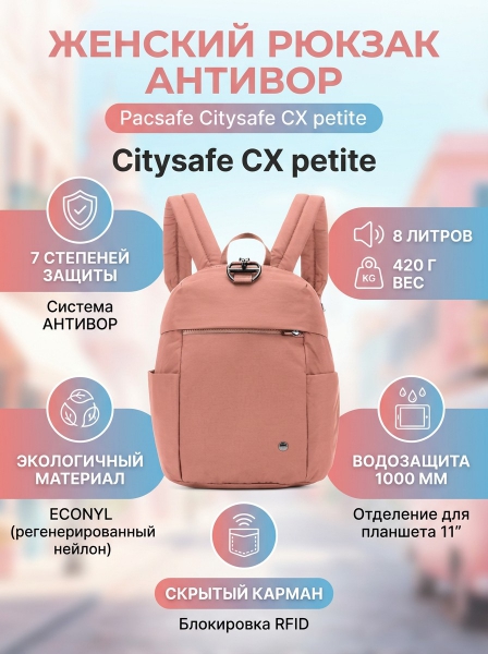 Женский рюкзак антивор Pacsafe Citysafe CX petite 8 л розовый ECONYL - ОписаниеЖенский рюкзак Citysafe CX backpack petite - минималистичный и элегантный повседневный рюкзак объемом всего 8 литров. Универсальный дизайн этого рюкзака позволяет носить его с одеждой разного стиля от спортивного до кэжуал и делового. В рюкзаке есть отделение для ноутбука размером до 11 дюймов и скрытый карман на задней части под размер телефона или кошелька.