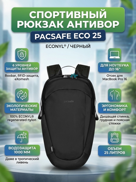 Спортивный рюкзак антивор Pacsafe ECO 25 черный ECONYL - ДоставкаДоставка по Санкт-Петербургу: бесплатно, 2-3 дня Доставка по России: стоимость уточняйте у оператора. Спортивный рюкзак антивор Pacsafe ECO 25 черный ECONYL - Отзывы0.0