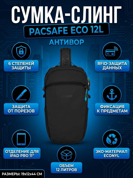 Сумка слинг антивор Pacsafe ECO sling backpack 12 л черная - ДоставкаДоставка по Санкт-Петербургу: бесплатно, 2-3 дня Доставка по России: стоимость уточняйте у оператора. Сумка слинг антивор Pacsafe ECO sling backpack 12 л черная - Отзывы0.0