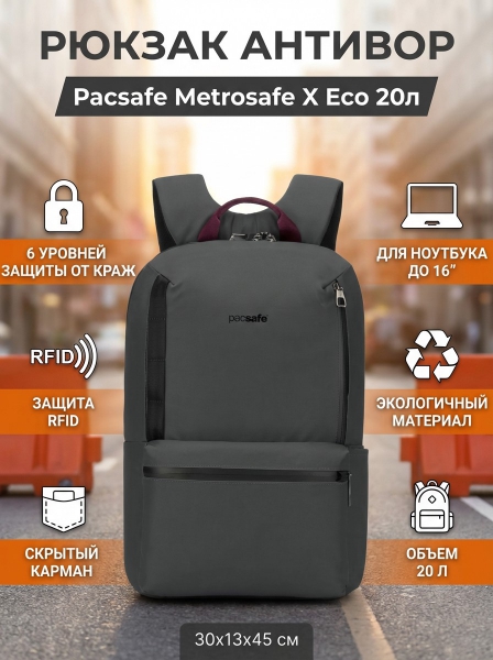 Рюкзак антивор Pacsafe Metrosafe X Eсо 20 л серый - ДоставкаДоставка по Санкт-Петербургу: бесплатно, 2-3 дня Доставка по России: стоимость уточняйте у оператора. Рюкзак антивор Pacsafe Metrosafe X Eсо 20 л серый - Отзывы0.0