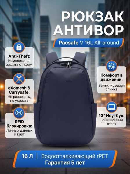 Рюкзак антивор Pacsafe V 16L All-around Backpack, синий, 16 л. - ДоставкаДоставка по Санкт-Петербургу: бесплатно, 2-3 дня Доставка по России: стоимость уточняйте у оператора. Рюкзак антивор Pacsafe V 16L All-around Backpack, синий, 16 л. - Отзывы0.0