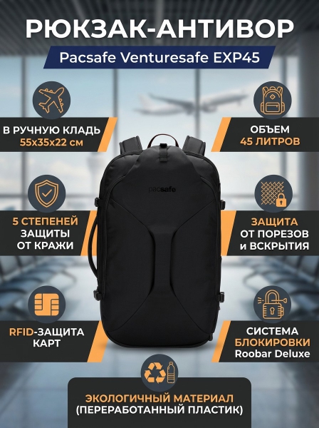 Рюкзак в ручную кладь антивор Pacsafe Venturesafe EXP45 черная смола - ОписаниеPacsafe антивор Venturesafe EXP45 – серьезный рюкзак для настоящего путешествия. 45 литров внутреннего объема продуманны и организованы таким образом, что позволяют взять все необходимое для длительного путешествия по Индии или веселого европейского трипа. Органайзер основного отделения – залог порядка в мелочах и безопасности ваших гаджетов с рюкзаком Pacsafe Venturesafe EXP45 Рюкзак в ручную кладь антивор Pacsafe Venturesafe EXP45 соответствует самым строгим требованиям и нормам, предъявляемым авиакомпаниями «Победа», «Аэрофлот», «РОССИЯ», «Уральские авиалинии», «S7», «UTAIR» и т.д., к ручной клади. Путешествуешь налегке или едешь в короткую командировку. В рюкзаке Pacsafe Venturesafe EXP45 предусмотрено 5 степеней защиты от скрытого хищения. Рюкзак Pacsafe Venturesafe EXP45 не имеет аналогов в мире, все технологии запатентованы и уникальны. Рюкзак Pacsafe Venturesafe EXP45 изготовлена из 60 переработанных пластиковых бутылок.