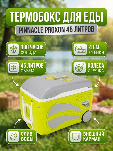 Термобокс Pinnacle TPX-2061-45 Proxon 45 L - ОписаниеТермобокс TPX-2061-45 Proxon – это настоящая находка во время путешествий, прогулок, пикников. Изотермические контейнеры поддерживают одинаковую температуру на протяжении долгого времени, что позволит наслаждаться свежими продуктами и прохладными напитками и не думать о том, что еда может испортиться, например, в жаркий день. Дополнительным плюсом является то, что термобокс не нужно подключать к электросети. Термобокс, вместимостью 45 л, очень удобно брать с собой. Он не занимает слишком много места, а также имеет ручку и колеса для удобной перевозки контейнера.