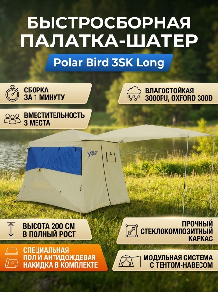 Комплект палатка-шатер летняя Polar Bird 3SK Long + Тент-навес - ДоставкаДоставка по Санкт-Петербургу: бесплатно, 2-3 дня Доставка по России: стоимость уточняйте у оператора. Комплект палатка-шатер летняя Polar Bird 3SK Long + Тент-навес - Отзывы0.0