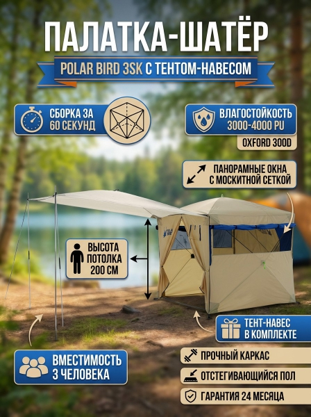 Один из существенных недостатков заключается в том, что палатка даже в собранном виде занимает много места и имеет большой вес. Ее неудобно и тяжело нести длительное время в руках, поэтому для пеших туристических походов она не годится. Универсальная палатка-шатер Polar Bird 3 SK с тентом-навесом. Быстросборная конструкция куб позволяет устанавливать и складывать палатку всего за 1 минуту. На входе установлена молния, что позволяет создавать различные варианты лагеря, используя дополнительный тент-навес и соединять им между собой палатки.