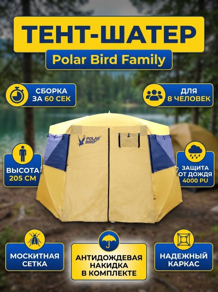 Тент-шатер для 8 человек Polar Bird Family - ДоставкаДоставка по Санкт-Петербургу: бесплатно, 1-2 дня2-3 дня Доставка по России: стоимость уточняйте у оператора. Тент-шатер для 8 человек Polar Bird Family - Отзывы0.0