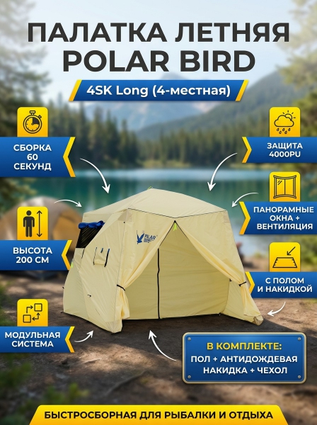 Палатка летняя Polar Bird 4SК long - ОписаниеОбновленная универсальная палатка-шатер Polar Bird 4SK Long для отдыха летом и зимой. В серии палаток-шатров SK (конструктор), на входе установлена молния, что позволяет создавать различные варианты лагеря, используя дополнительный тент-навес и соединять им между собой палатки. Приобретая палатку Polar Bird, вы получаете большую универсальную палатку-шатер для семейного отдыха или хорошей компании в любую погоду, а ее конструкция позволит не терять время на установку лагеря, а посвятить его общению с природой!