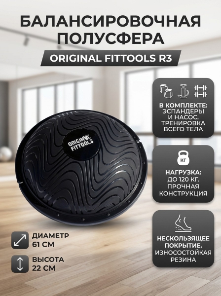Полусфера гимнастическая надувная с эспандерами и насосом Original FitTools R3 - ОписаниеДополнительное спортивное снаряжение, которое представлено в виде балансировочной платформы и выполненной из резины полусферы со специальным отверстием, помогающим регулировать её высоту и упругость, посредством накачивания или спускания воздуха.